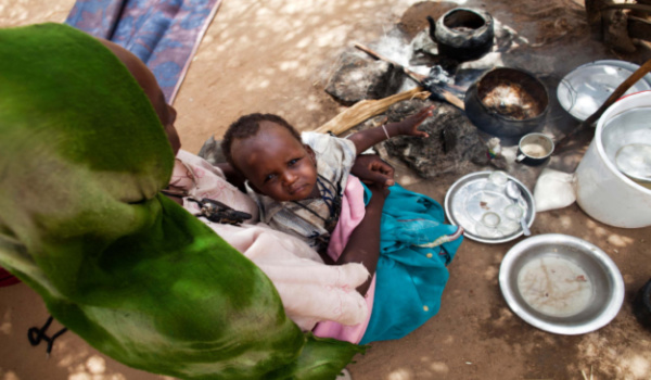A mother of six children holds her baby in a new area for displaced families at the outskirts of El Sereif, North Darfur, after her husband was recently killed.
