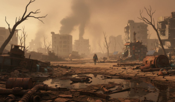 Severely polluted land under a damaged climate, highlighting the immense financial and environmental cost required for rebuilding and restoration.
